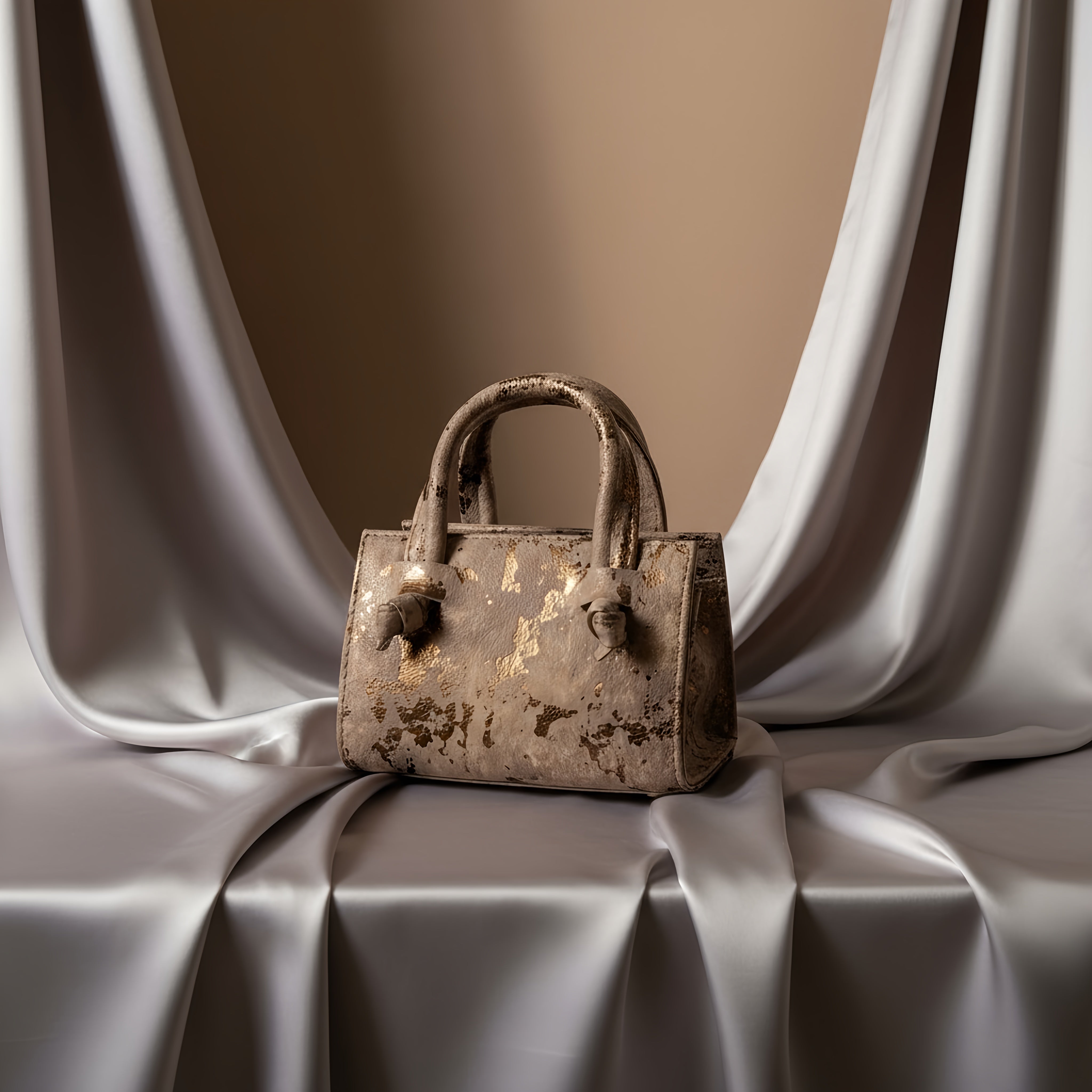 The Micro Aria is unapologetically compact, a boxy silhouette defined by bold proportions and its signature knotted top handles. It opens to reveal two internal slip pockets, lined in soft black velvet, and secures with a central magnetic tab closure.